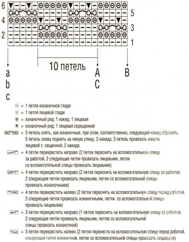 Набрать на спицы 67 (72) 77 петель и вязать фантазийным узором, при этом после кромочной начать у стрелки А/В/С, раппорт повторить 6 (6) 7 раз и перед кромочной закончить у стрелки a/b/c.