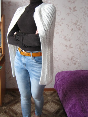 Был у меня белый жилет. Состав не помню. Покрылся катышками , и я его распустила. А так как погода не радовала теплом, а отопление на работе уже отключили, то возникла идея связать накидочку.Выбрала незатейливый узорчик.Отыскался он как-то невзначай,даже не помню на каком сайте.Очень легко и быстро вяжется.А это бывший жилет.