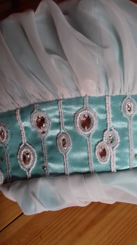 Вот так решила украсить пояс и ворот.Пришила стразы,приклеила стразы поменьше и обшивала бисером разной величины и прозрачности.
