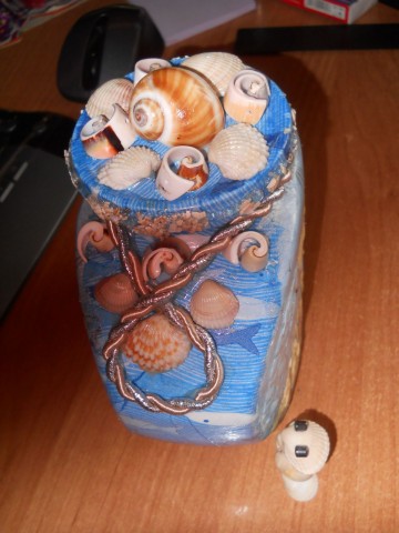 Большая юанка из под кофе долгое время стояла без дела, всё думала, как бы её оформить, а как увидела парусник и морской тематики салфетки "картинка" оформления сложилась в голове.