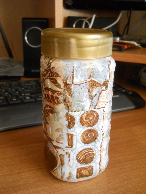 Каждая вещь в доме рукодельницы - это целая история, которая начаться может по-разному, но заканчивается всегда интересно - появляется что-то неповторимое и эксклюзивное. Не знаю почему, но люблю прикладную вышивку, декупаж, а в особенности нравится, когда из ненужной вещи, практически утиля получается что-то действительно стоящее. "Кофейные банки" - это целая история. Сын попросил хоть как-нибудь украсить баночку под кофе... ну и - понеслось. В дом буквально потёк ручеёк использованных банок и баночек. Сын учится и работает санитаром на станции скорой помощи, на смену принесёт то одну, то другую баночку с кофе, а у баночек обложка разная, спрашивают, где ты такие купил, а он, юморист, говорит - принимаю заказы