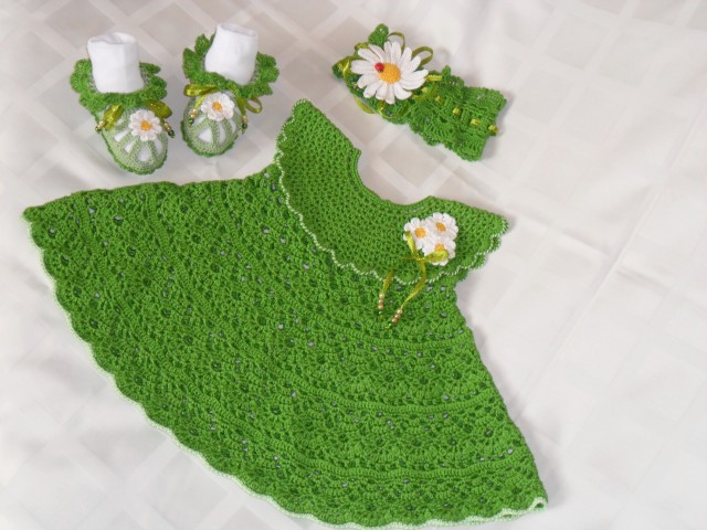 Связался вот такой комплектик с ромашками. Очень нравится вязать вещи для маленьких, а внуков нет, вот и складываю в мешок. Может найдется маленькая хозяйка.