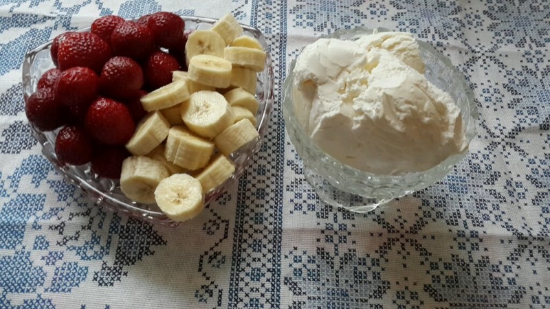 В нашем магазинчике появилось сливочное мороженое в бумажной расфасовке-весом в полкило. Жара, и я решила оторваться по полной программе! Купила 300 гр.клубники,4 бананчика, перемешала миксером,и мой десерт готов! Вкуснятина!