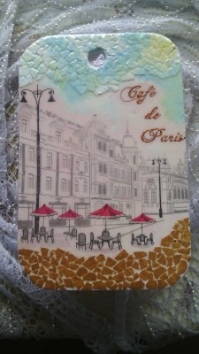 Головняк от этого Парижа. Салфетка была моя, но выбор не мой. Роды были трудные, но то, что в результате выродилось — мне даже понравилось.Картинка — монохром с добавлением красного цвета. Скучно. Пришла идея добавить газету с французским текстом. Наклеила газету, сверху грунтовка под салфетку, снизу немного картинок на кофейную тему, сверху лента тоже про Эйфелевую башню. Эмблема приклеена отдельно — кусочек кожи при помощи горячего пистолета, вокруг кружево. Но! Я сама была в Париже дважды: в апреле и в октябре. Да, серо и сыро. Но гламурно! Поэтому и появилась подрисовка и блёстки!