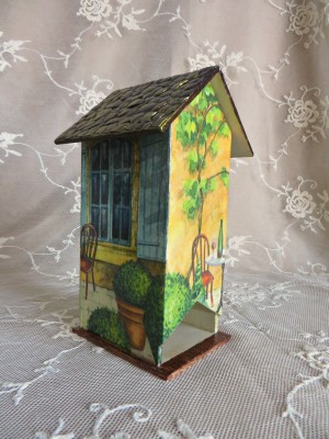 По дереву работала впервые. Многострадальный чайный домик. Всё началось с заказа на вырезку домика, т. к. такие тут не водятся. Несколько раз приходилось переделывать, не совпадали размеры деталей. А в остальном тоже не всё гладко было но я не сдавалась и вот результат.