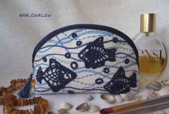 Эта и следующая косметичка- мое несостоявшееся платье из ирландского кружева. Мотивы связаны плотно из тонкой нити и связав n-ное их количество я поняла, что платье буду вязать до морковкина заговенья и оставила мысль о платье. Но, зато появились 2 косметички и еще на пару осталось:-).