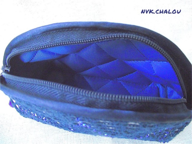 Здесь сетка не связана, а вышита. К молнии я прикрепила цепочку со стеклянными бусинами в цвет основного материала. Цепочку можно использовать как ручку, а можно снять. Обратная сторона черная.