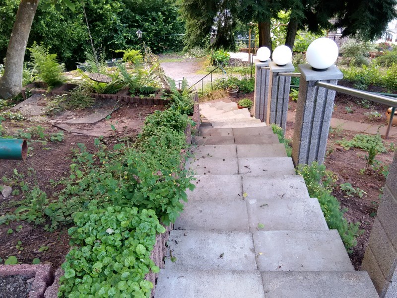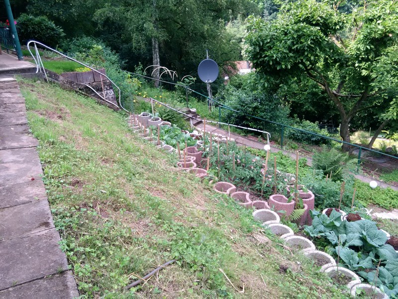 Мой сад-огород необычный по вынужденной причине, очень большой наклон земли. Выпрямить, возможно, и реально профессиональными силами, но я всё делаю сама. Вернее, начинала сама, сейчас муж помогает. Поверил таки в то, что "горы можно свернуть"! Садом я занимаюсь уже пятое лето. Ну как занимаюсь? Первый год ходила и всплёскивала руками: и как нас так угораздило вляпаться? Сада не то что не было, даже дорожек и перил не было видно! Было много дикой ежевики, дикой крапивы и всего другого дикого, колючего, жгучего и переплетённого. Люди, которые жили в доме до нашей покупки, не являлись здесь хозяевами, они его снимали лет 15 и ничем не пользовались. Првые два года я тупо решала поставленную самой же перед собой задачу всё это очистить. Поскольку дом был тоже в запущенном состоянии, муж занимался ремонтом внутри и снаружи.