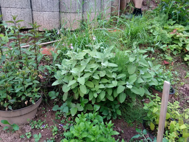 Поскольку они разрастаются просто со скоростью метр в ширину за неделю, я их ограничила в этом, посадив в горшки, вкопанные в землю. Растёт мята чёрная, мята испанская, мята душистая, мята кошачья и какая-то ещё.