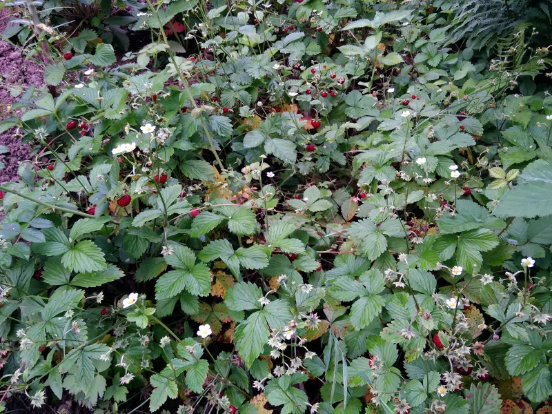 Ниже по уровню вдоль дорожки единственный оставленный мной кусок дикой природы. Лесная ягода! Вкуснючая, сладкая красота! Первые пару лет мы её ели вдвоём с мужем, дети ни-ни..! Как ни уговаривали! А теперь за уши не оттащишь!