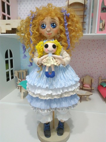 Солнышко - авторская коллекционная текстильная куколка. Личико объёмное. Крепления ручек, на шплинтах, ручки и пальчики на проволочном каркасе, сгибаются, фиксируются в нужном положении, голова поворачивается. Волосики кукольные трессы. Одежда вся съёмная: комбинезончик, нижняя юбочка, платье, сарафанчик, ботиночки, так же сделанные мной. В руках держит куколку Лалалупси.