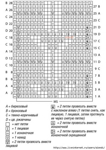 Начать с 1 кромочной, раппорт постоянно повторять, закончить петлей после раппорта и 1 кромочной. Постоянно повторять 1–28-й ряды, при этом соблюдая указания цвета нити.