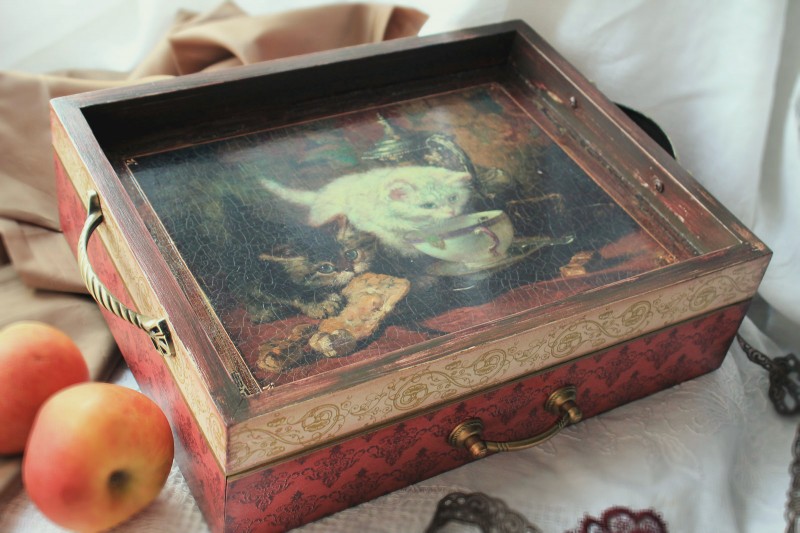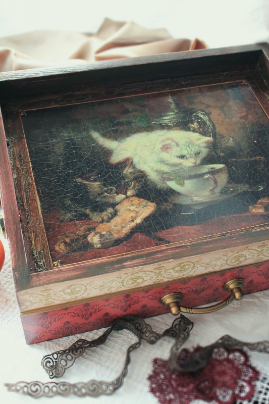 Изображение - кракелюр двухшаговый( шеллак+ гуммиарабик) и одношаговый( в трещинках античная бронза , старение, фурнитура под античную бронзу. Внутри морение водной морилкой "под дуб".
