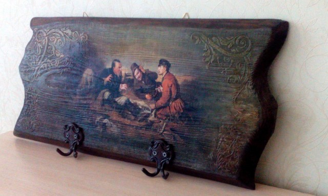 А я опять с о своими деревяшками! Люблю работать с сосной. А знакомые с детства картины русских художников задают тему и настроение. В этот раз я уже сама элекролобзиком обрезала края. Ну и дальше, как всегда: обжиг, браш, вживление, трафарет, подрисовка. Вот такое сочинение по картине русского художника Перова Василия Григорьевича.