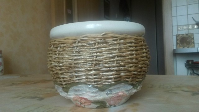 Беллочка и Иришка присвоили мне почетное звание хламдекоратора) Продолжаю его прославлять) Предыстория: Часть нашей редакции переезжала из одного кабинета в другой. Прибежал ко мне наш фотограф Олег и протягивает цветочный горшок, весь черный по низу. Говорит: "Таня, вот нашел, тебе наверное пригодится". Уже вся редакция знает, что собираю добротный хлам на переделку) Горшок целый, крепкий, только сгнила веревочная оплетка понизу. "Ой, Олежа, спасибо тебе огромное," - сказала я и потащила горшок в норку. Дома счистила все сгнившее, отмыла, обмазала шпатлевкой и задекупажировала. Верх трогать не стала, он хороший, только лаком покрыла. И вот результат