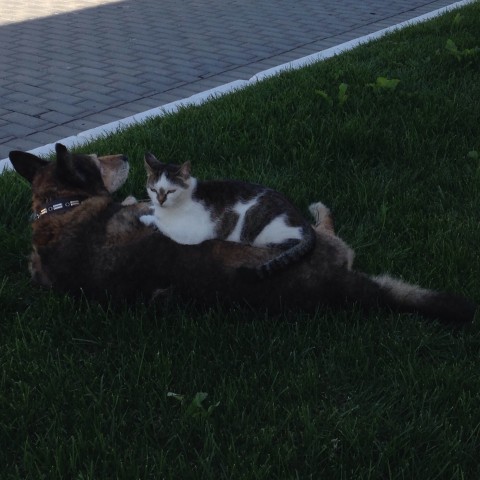 Похоже что они и живут вместе)На собаке ошейник, наверно их вместе выгуливат хозяин