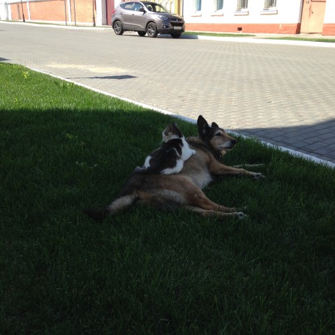 Действительно, живут как кошка с собакой!!! Мило. Наша немецкая овчарка и кошка всегда спали, прижав нос к носу. Спасибо за фотографии.