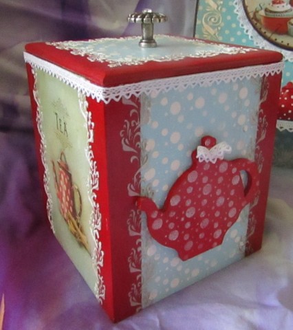 К часам . которые уже показывала, сделала в дополнение короб , я так думаю, для чая, ну такой уж нарядный получился, прям вырви глаз! Ну опять расстаралась, всего больше, чем надо!! Использовала в работе декупажную карту, трафареты , голубой фон нарисован, горошки через трафарет , по боковинкам с трафаретным орнаментом прошлась медиумом для состаривания, а потом еще и контуром,чайнички - это из МДФ, покрашены и горошек через трафарет, ну и кружавчики , т.к. на часах они тоже есть . Ну точно, я сорока, уж так люблю , чтобы всего много да ярко было!