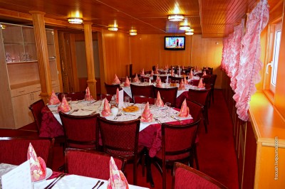 Теплоход трехпалубный. Моя каюта была на средней палубе. Все удобства в наличии. всего теплоход рассчитан на 150 человек. Два ресторана. Библиотека, бар, концертно-танцевальный зал. Кормили просто великолепно. Утром завтрак «шведский стол» очень разнообразный, обед и ужин на заказ, выбор из трех разновидностей каждой подачи. Вечером фужер вина, утром для любителей шампанское. Набор экскурсий отличный. Дополнительно взяла только одну экскурсию в музей водки ( святое дело посетить). Планировала плыть одна, но в напарники попросилась приятельница. Но и одному скучно не будет. Во время переходов были мастер-классы по мыловарению. Скрипичные концерты, дискотеки, конкурсы. Круиз назывался «Ретро», так что все было близко нашему возрасту. Кстати, при многоразовом заказе круизов в этой турфирме делают большие бонусные скидки. Так мне путевка обошлась очень экономно.