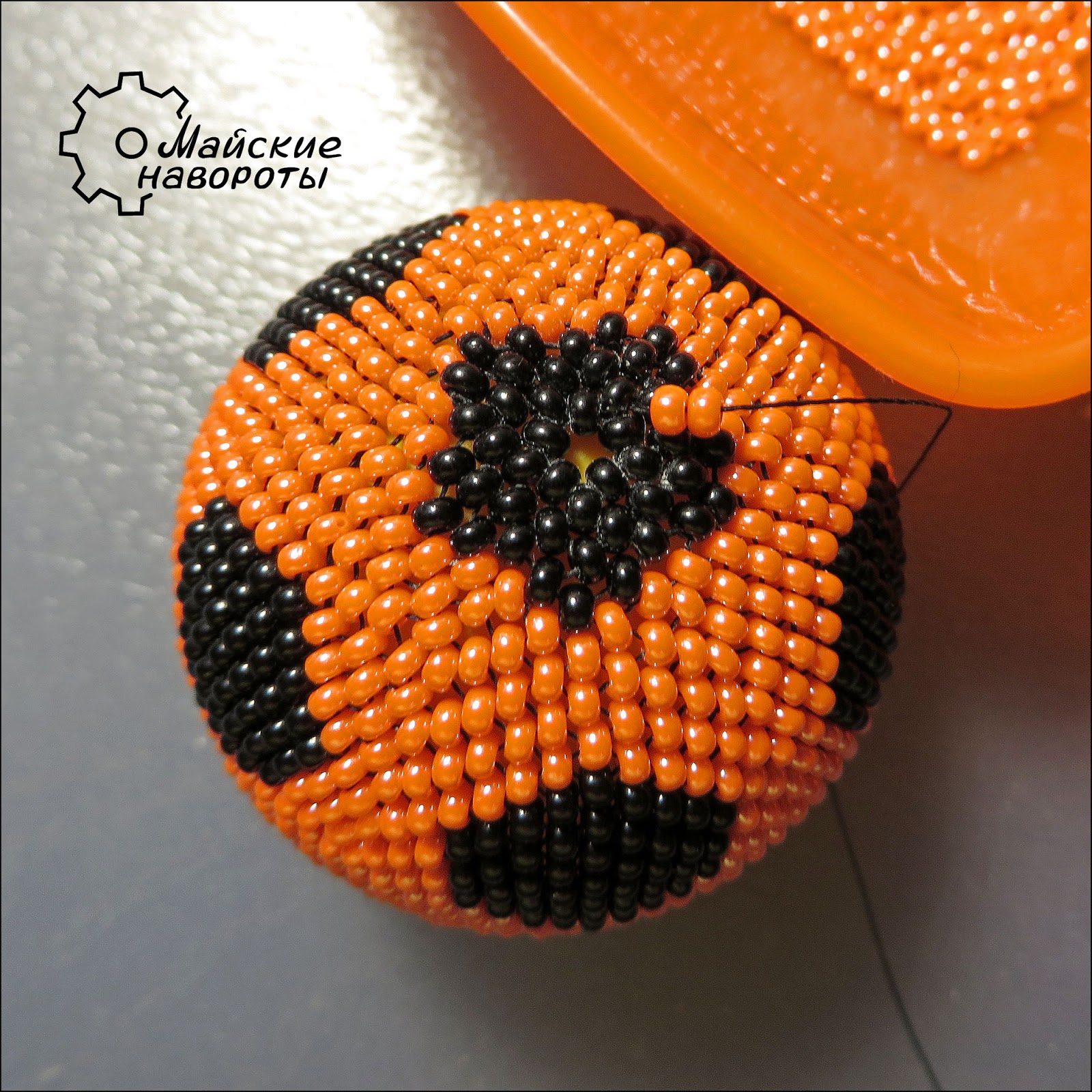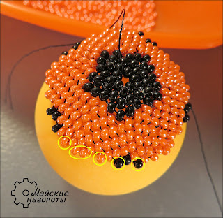 7. Шестой ряд. 1 черная - 2 оранжевые. Надеюсь, читатели мастер-класса знакомы с мозаичной техникой плетения по кругу, и видят, что шаг в 2 оранжевые бисерины шестого ряда находится над шагом в 2 черные бисерины третьего ряда.
