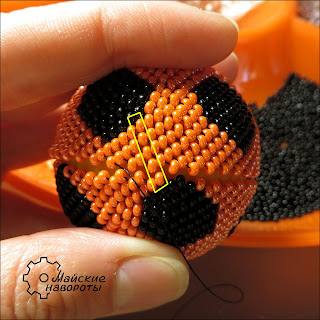 4. Третий ряд, шаг в 2 черных бисерины. Здесь и далее желтыми кружочками (одна бисерина за шаг) и овалами (две бисерины сразу) будет указан паттерн ряда, чтобы не потеряться на мяче.