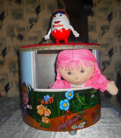 "Мне отдали журнальный столик, круглая тяжеленная столешница на фанерном барабане, жаль, что не догадалась сфотографировать первоначальный вид. Так вот барабан был обтянут дермантином, который основательно был потрёпан когтями кота. Так, как столиков у меня предостаточно, поэтому решила внучке сделать ящик для игрушек, сверху вырезать отверстие не возможно из-за крепежа, тогда попросила деда сбоку отверстие вырезать, чтоб игрушки складывать, хотела сделать декупаж, но ..."