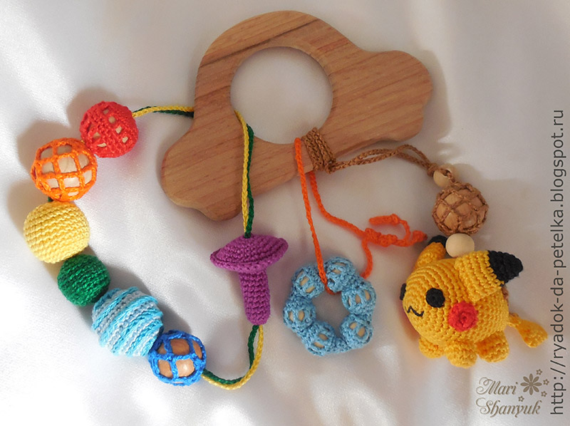 Яркий и ароматный грызунок непременно вызовет интерес у малыша. Бусины двигаются по веревочке и их можно продевать через колечко (развитие мелкой моторики). Бусины обвязаны с использованием разных техник, что будет развивать тактильные ощущения малыша. Разноцветные бусины помогут запомнить все цвета радуги. В гвоздике спрятан бубенчик, гаечку можно одевать на гвоздик. Покемона можно отцепить и использовать как кулон/брелок/игрушку для коляски/кроватки.