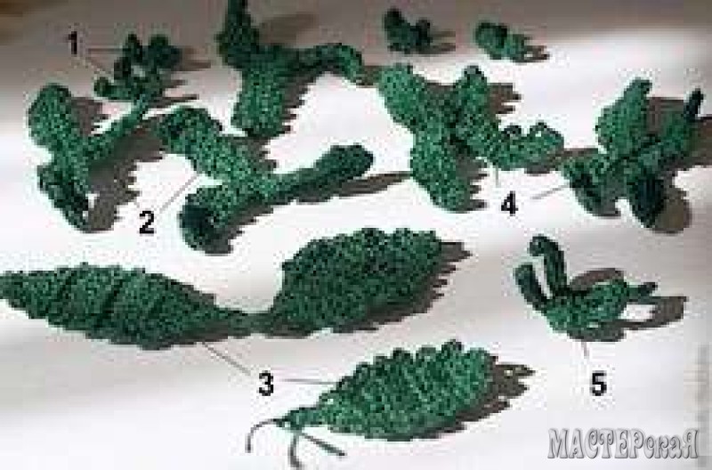 Листья 3 насаживаются на проволоку. Их лучше всего использовать по внешнему краю, т.к. им можно придать любую желаемую форму. Вяжем их по схеме 5