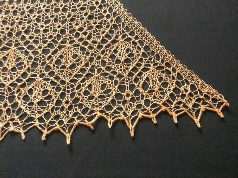 Шаль вязалась как тестовый образец новой шали и в самом конце, при закрытие петель, не хватили буквально 2-3 метра льна и самый кончик (с правой стороны) закрыла шерстяной ниточной схожего цвета.