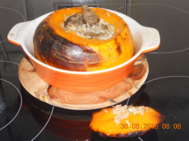 Хочу показать свою тыковку!Ё Я впервые выращивала тыкву и готовить ее не умею (ну как то в семье у нас никто ее никогда не готовил, не приучена))) ) Выращивала тыкву до 1,5 кг. Маленькие, хорошенькие выросли, а что с ними делать не знаю. Рецептов много, а вот ни один не вдохновил(((.... У кого ни спрошу все говорят: Делай сок. Я не люблю долго готовить, лень возиться. И вот что я сотворила. Вымыла тыкву, сверху срезала крышечку, ложкой вытащила серединку с семенами и в сторону. Говядинку нарезала кусочками посолила, поперчила и обжарила, добавила нашинкованный лук и нарезанную кусочками курагу, и далее обжаривала слегка. Добавила водичку и сыпанула рис. Все потушила до слегка недоготовности риса))))) На зубок. Вот же лентяйка, отдельно рис лень было варить. Начинила тыкву и еще сверху 3 стол. ложки бульона налила (зачем не знаю, видимо- чтобы былО)К сожалению не фотографировала этот процесс.