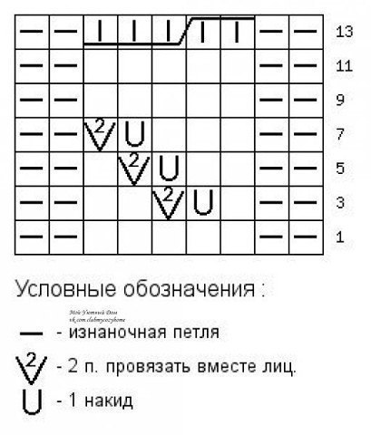 5 - й ряд — * 2 изнаночные, 2 лицевые, накид, 2 вместе лицевой, 1 лицевая, * 2 изнаночные.