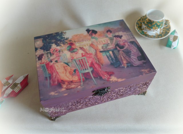 Я за это время тоже без дела не сидела, кое-что натворила. Хочу показать чайную шкатулочку "Французское чаепитие". Мне давно нравилась картина Хуана Сала "Чаепитие в Париже" ( в некоторых источниках "Послеобеденное чаепитие".) И вот решилась её в дело пустить.