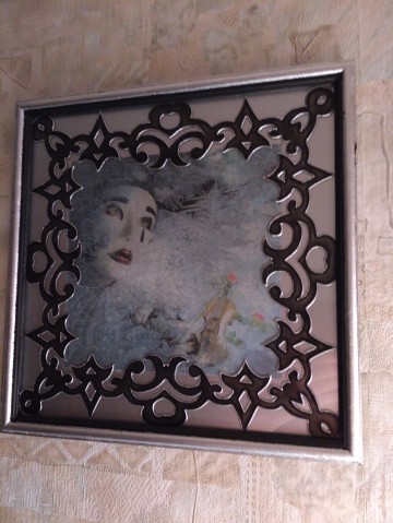 Технику выполнения фона даже не знаю, как охарактеризовать - обратный декупаж, вживление в стекло. Затем оборотная сторона покрыта краской-спрей серебряного цвета.