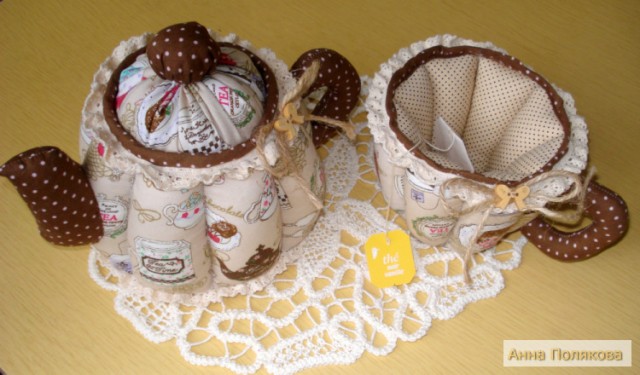 Аня, очень симпатичные работы! Чайничек коричневый, такой шоколадно-аппетитный, хорошую ткань выбрала заказчица))))