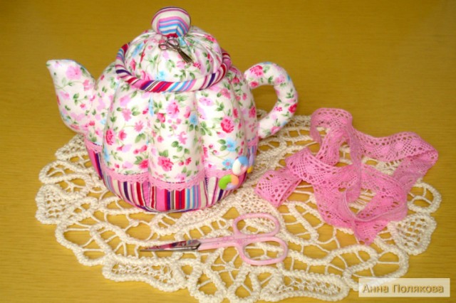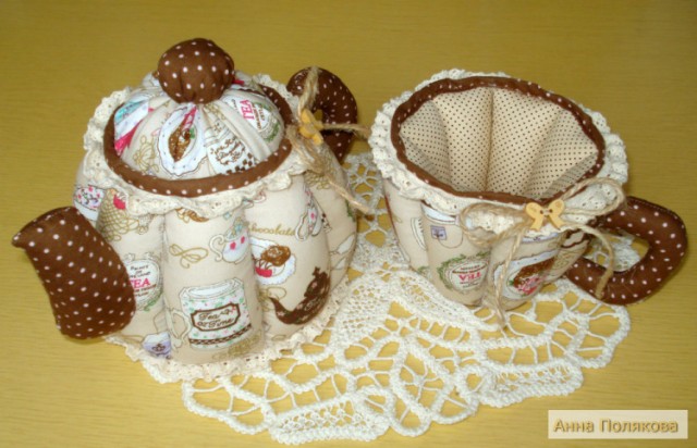Получила ещё один заказ на текстильную посуду. Заказчица сама выбрала ткани для чайника и чашечки. Мне самой эта расцветка очень нравится, одно удовольствие было шить.