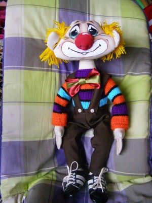 КЛАССНЫЙ ФЁДОР!!! Оля, у тебя замечательный клоун получился! Очень позитивный, яркий, какая у него лучезарная улыбка с грустинкой, а кепка как у Попова, кофточка красивая, бабочка… Очень всё понравилось!!! Умница — рукодельница!
