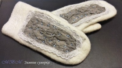 На этих варежках я попробовала привалять органзу, посмотрев МК с участием Катерины Коршун. В принципе получилось. Органза даже в большей степени не приваливается, а складывается в такие складки и так лежит. Если потянуть, то она приподнимается, а отпустишь, и она опять ложится на место.