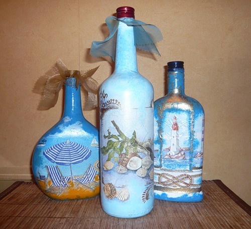 Освоив увлекательный и несложный декупаж бутылок для начинающих, обычные и нестандартные бутылки из-под вина, коньяка, шампанского или еще не распитые бутылки можно превратить в настоящие произведения искусства, которые приятно удивят, порадуют глаз, а в качестве подарка тронут до глубины души. Что может быть лучше подарка, сделанного собственными руками, в который вложено тепло, любовь и частичка души?Оригинальная бутылка, которой трудно найти достойное применение, но и выбросить жалко, с помощью техники декупажа легко превращается в эксклюзивный графин для спиртных напитков или необычную цветочную вазу. Самое приятное заключается в том, что эта уникальная техника доступна абсолютно каждому, ведь она не требует специальных навыков, особых материальных и физических затрат. Главное – огромное желание, немного свободного времени и море креатива! Интерьерные украшения из стеклянной тары
