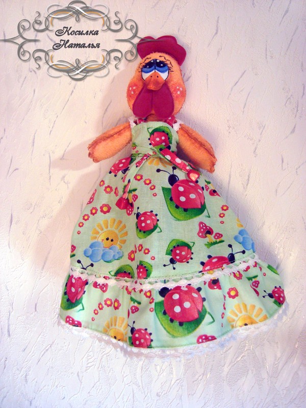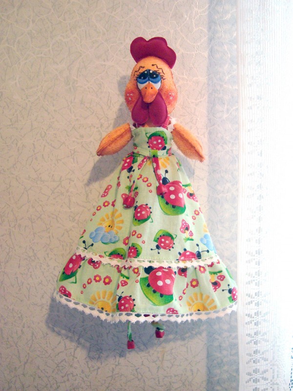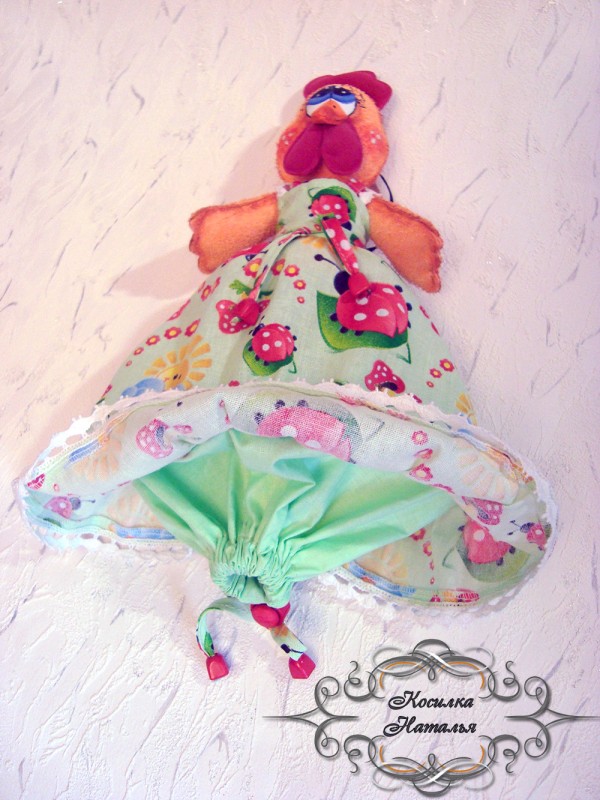Поэтому и родилась эта кукла пакетница. В преддверии Новогодних праздников петушок конечно был бы уместнее. Но я пока не придумала, как сшить и приспособить штанишки петуха для хранения пакетов. Может быть кто-то из мастериц подскажет мне.