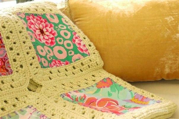 Вот так интересно можно создать плед. Все оставшиеся кусочки ткани пригодятся, да и пряжу можно разного цвета подобрать.