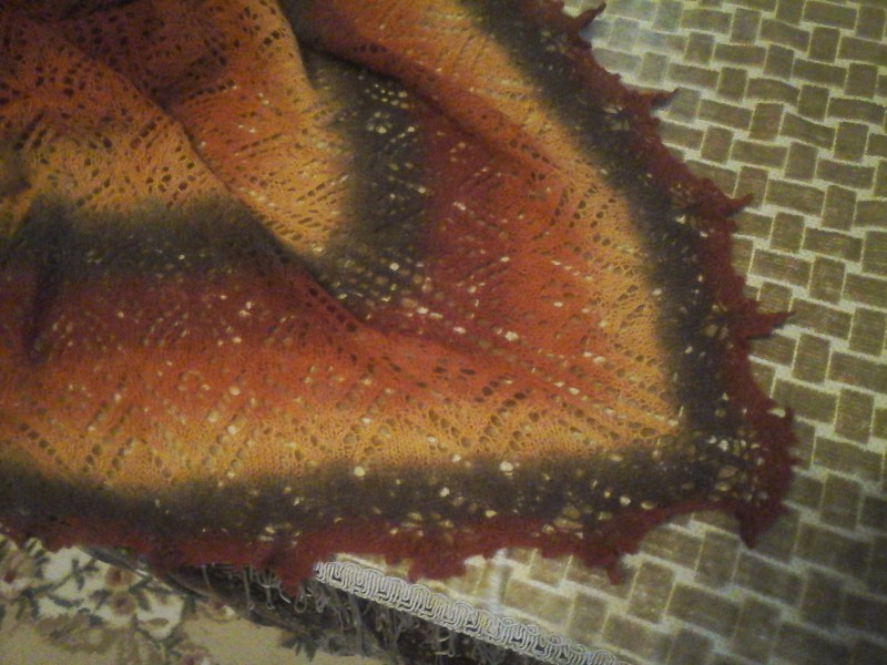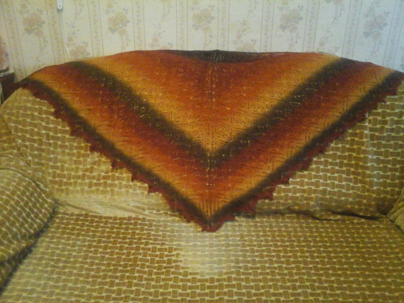 Благодаря этому сайту я узнала о пряже Кауни и влюбилась в нее. Это одна из моих первых шалей, которую связала для дочери. Размер по ленточке 180 см, а по высоте 90 см, вес 110 г