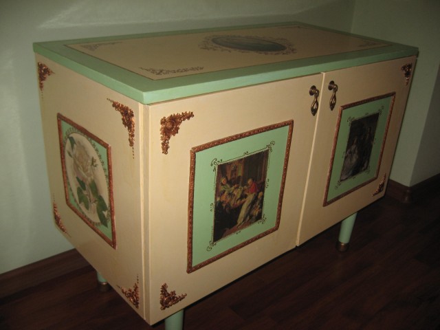 Здравствуйте, дорогие мастерицы! Каждый день смотрю рассылки нашего сайта, любуюсь вашими чудесными работами, а сама давно ничего не показывала, все не решалась выставить на общее обозрение. Но вот закончила реставрацию старой советской тумбочки и решила вам показать. А вдруг кому-то понравится идея. А дело было так. Старая советская полированная тумбочка предназначена была на выброс. Но поскольку в каждой декупажнице сидит этакая жабка, которая не позволит что-то выбросить, пока не приложит к нему свои ручки, то судьба тумбочки была решена. И попала она в мои руки на растерзание.