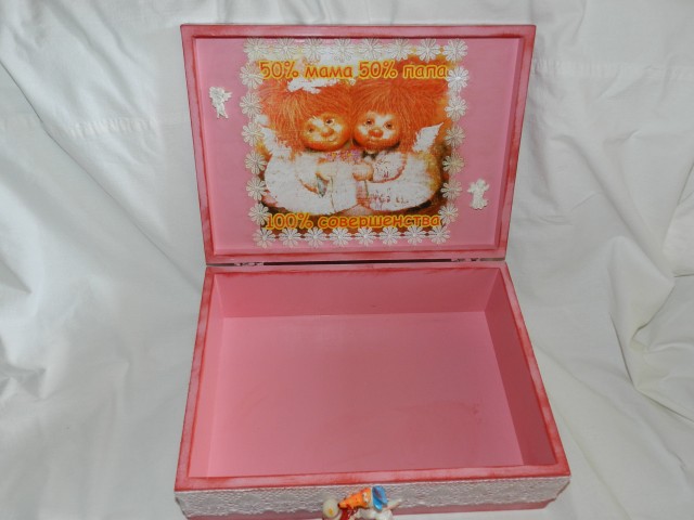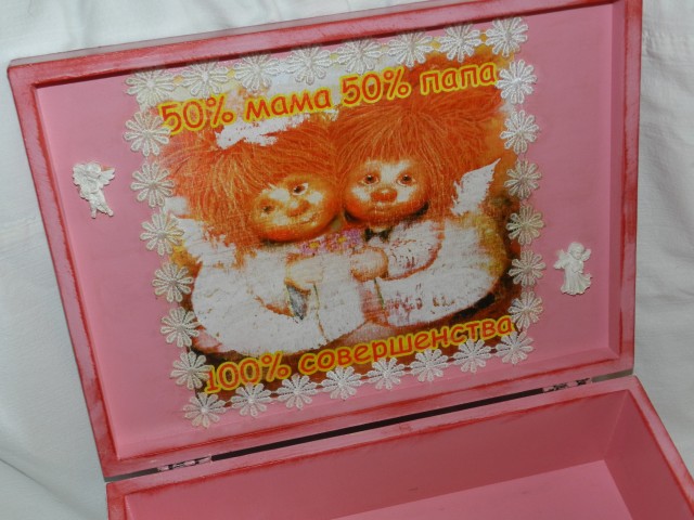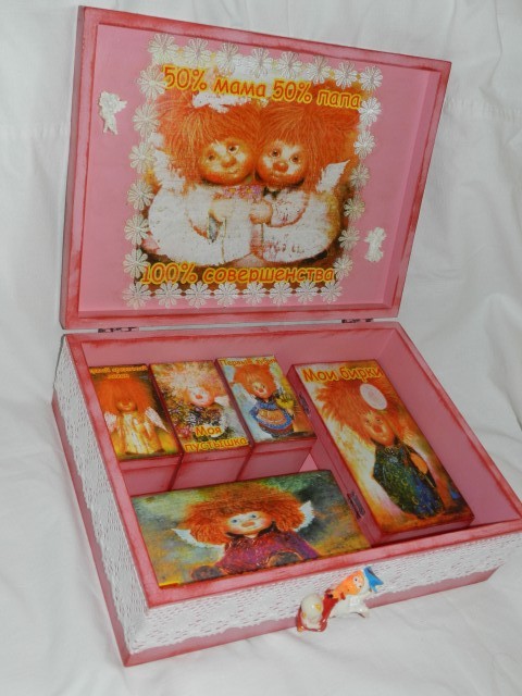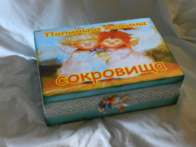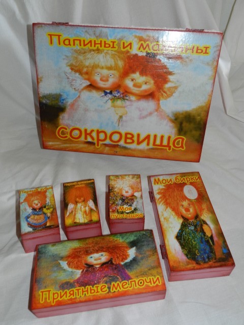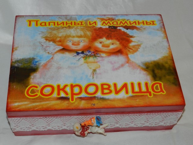 Сотворились "Папины и мамины сокровища". В разные семьи. Для девочки Киры и мальчик Ермака. Заготовки фанера,декупаж, краска, лак
