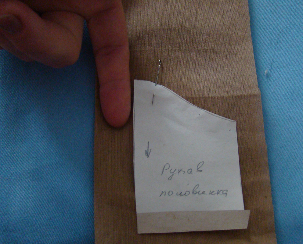 А рукав опять требует к себе внимания. Он у нас широкий, поэтому внизу закладываю 5 складочек, идущих спереди назад, закалываю булавками,