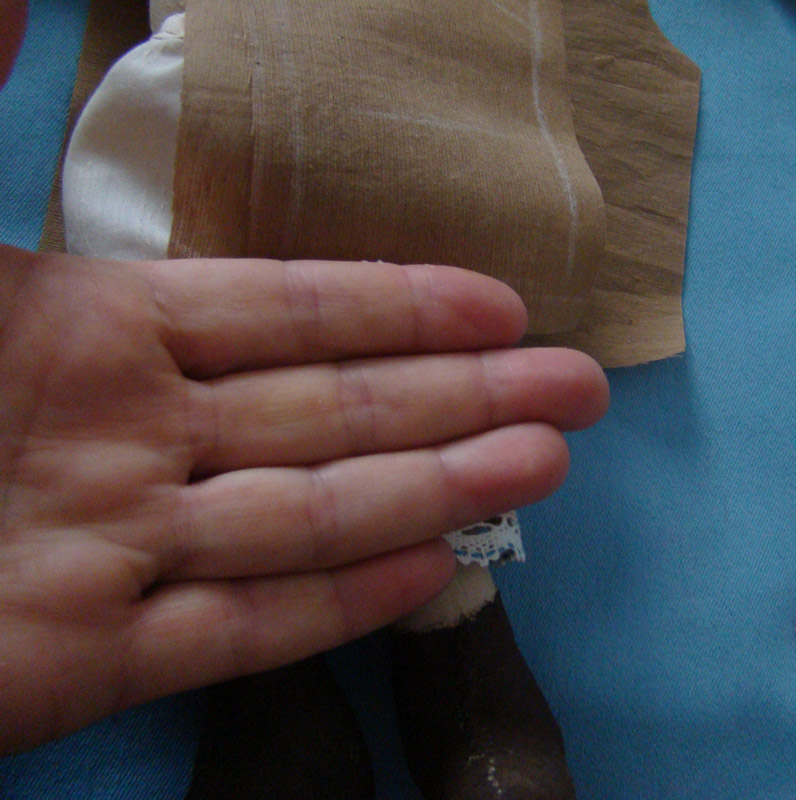 Теперь определимся с юбочкой платья. Накладываю верх платья на куклу и прикидываю, что готовая юбка должна быть около 4-х пальчиков по ширине, запомнили?