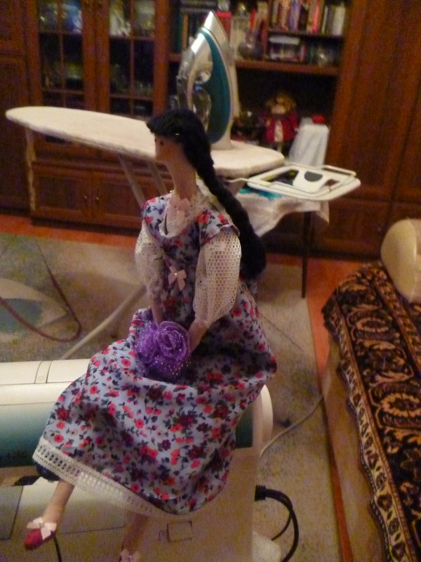 Это тоже был заказ для девочки-школьницы. Как обычно, придумывалось неделю, потом болела, и только за 2 дня до отдачи начала ее шить. Как обычно, шилась пол-ночи перед отдачей. И тоже моя Карашаш (Черноволоска) сама выбрала ткань на платье из моего чемодана тканюшек. Рост - 50 см