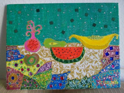 В СЕРЕДИНЫ ФРУКТОВ, НЕИЗВЕСТНОГО ПРОИСХОЖДЕНИЯ, НАНЕСЛА СТРУКТУРНУЮ ПАСТУ(ТОНКУЮ-ОНА ВЫСЫХАЕТ ТАКАЯ НЕЖНЕНЬКАЯ СТАНОВИТСЯ) И В НЕЙ УТОПИЛА СТРАЗИНЫ,РУЧЕНЬКИ МОИ НЕ СЛУШАЛИСЬ.ИЗМУЧИЛАСЬ ВСЯ ПОКА ИХ НАТОЛКАЛА)))ОНИ НОРОВИЛИ ВСЕ ВРЕМЯ ВВЕРХ НОГАМИ ПАДАТЬ))) НА ВСЕ ОСТАЛЬНОЕ ПРОСТРАНСТВО -КРАКЕЛЮРНЫЙ ЛАК ОДНОШАГОВЫЙ,ВЫДЕРЖАЛА ЧАС ПО ИНСТРУКЦИИ