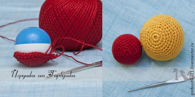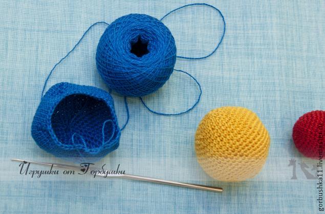 Вот первая примерка (фото ниже), после которой нужно вязать ряды без прибавок. Шарик должен быть обвязан практически плотно. Синтепон не кладем — это жесткая горошинка.
