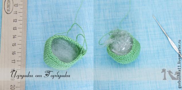 Если горошина недостаточно умешается, то провязываем дополнительно ряд или два просто ст.б.н. Закрепляем рабочую нить.