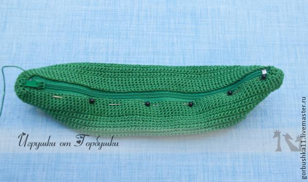 Внутрь стручка пришиваем жесткую часть липучки с крючками, а на горошины вырезаем и пришиваем круглую пушистую часть липучки.